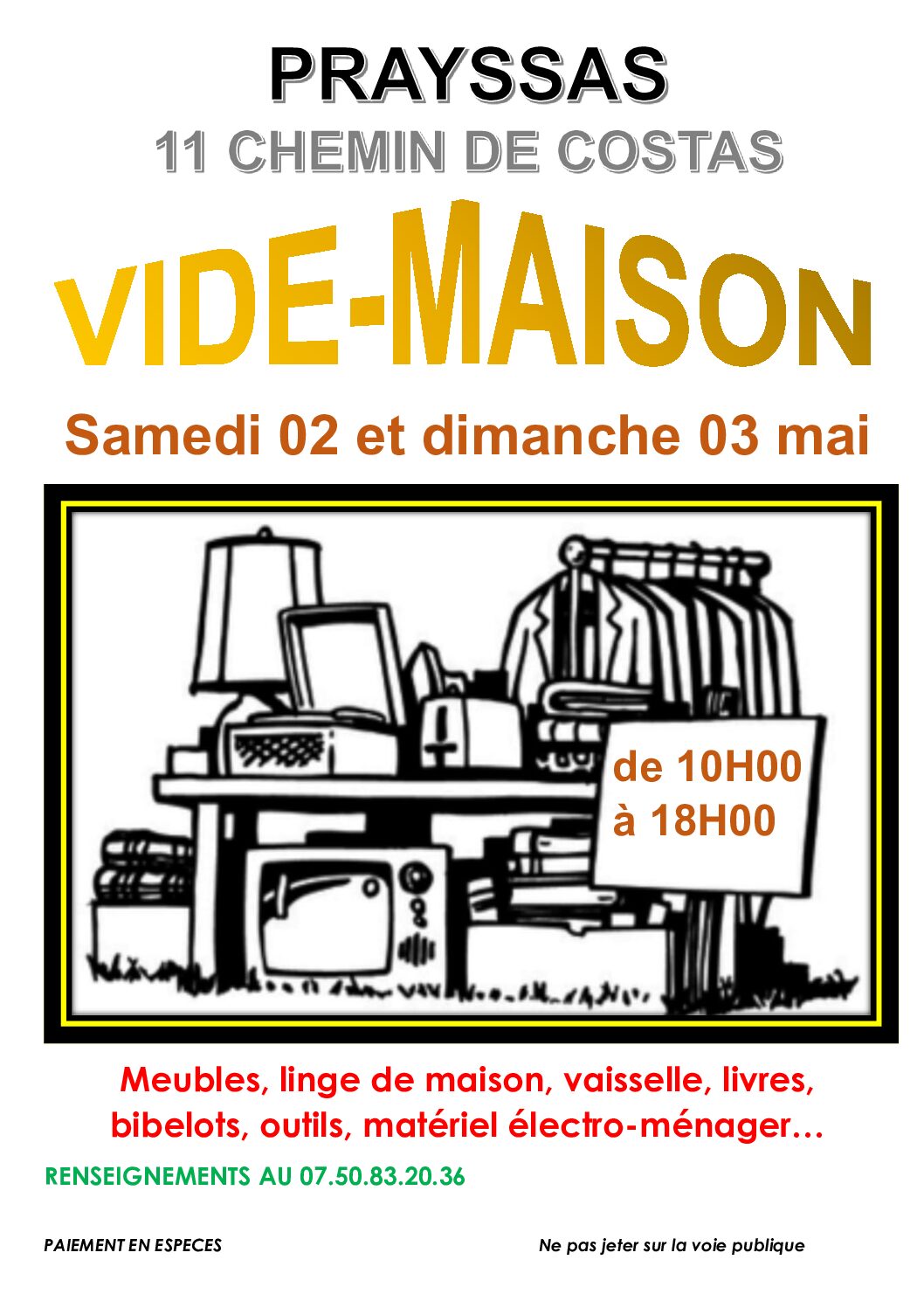 VENTE DE MEUBLES, LINGE DE MAISON, VETEMENTS, LIVRES,