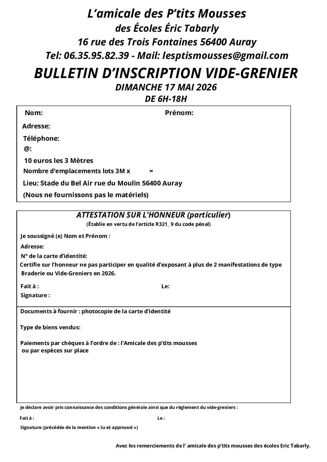 L'Amicale des p'tits mousses des écoles Éric Tabarly de AURAY organise sont Vide-Grenier annuel le Dimanche 17 Mai 2026.